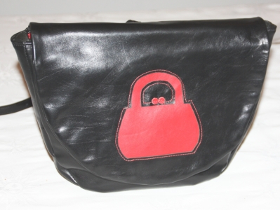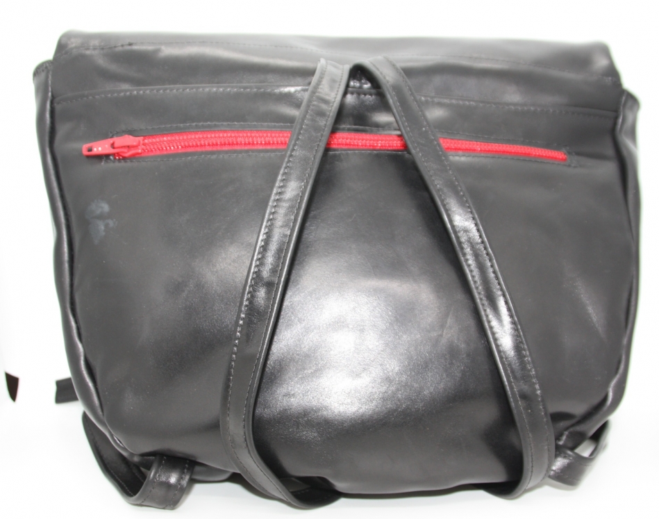 Zwarte kalfsleren rugtas, de klep heeft voorop een uitgesneden tas waar rood leer achter zit. De tas wordt onder de klep afgesloten met een rits, is met katoen gevoerd en voorzien van een ritsvak en een telefoonvak. De tas heeft achterop ook een ritsvak. De tas loopt rond.