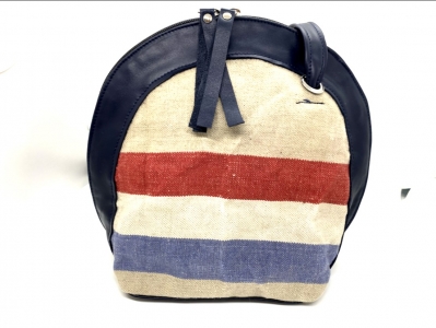 Nederlandse posttas met een rand van donkerblauw rundleer. Gevoerd, en afsluitbaar met een rits. Voorzien van een ritsvak en telefoonvak en natuurlijk een schouderband.