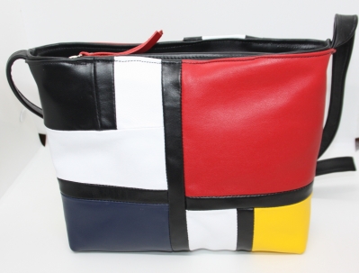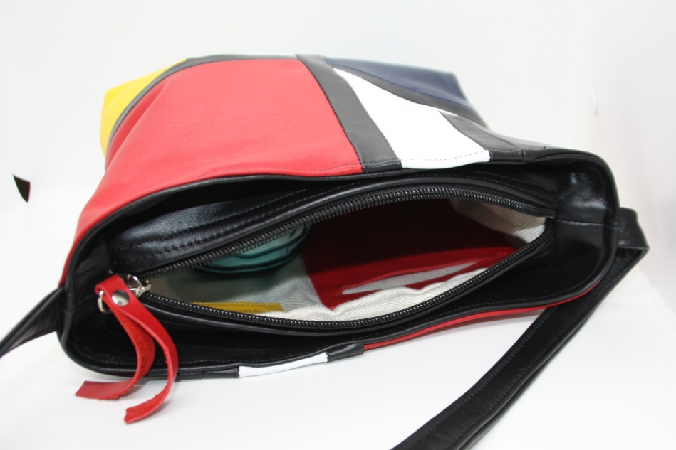 Deze medium-grote rundleren schoudertas is uitgevoerd met een vlakverdeling in de stijlkleuren: rood, wit, blauw, geel en zwart. De tas is afsluitbaar met een rits, gevoerd en voorzien van een ritsvak en telefoonvak. De tas is ook in de volgende twee maten verkrijgbaar: Klein: 18 cm hoog, 21 cm breed, en 7 cm diep. Groot: 28 cm hoog, 26 cm breed en 12 cm diep.