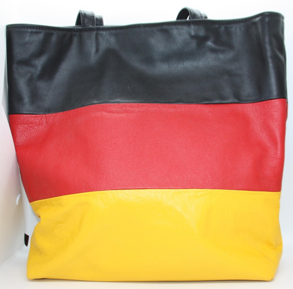 Een rundleren shopper, geïnspireerd op de Duitse vlag. De tas is met katoen gevoerd en voorzien van diverse vakken en een sleutelkoord. De tas sluit met een magneet.